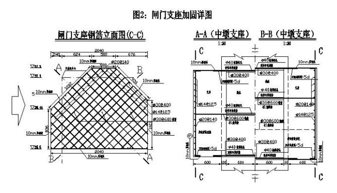 由于使用不當造成翻板閘門支座破損,因此可按原設計進行修復。將受損的支座砼清理鑿除后,重新澆筑C30鋼筋砼支座。加固方案為:采用植筋法將閘門支座鋼筋錨固在閘墩中,閘門支座四周預埋鋼板以增強支座抗拉剪能力。詳細做法是: