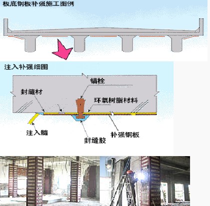 鋼板補強工法是利用環(huán)氧樹脂特有的優(yōu)良粘接性能和可注入性,將補強用鋼板采用錨栓固定在混凝土表面,并在間隙處注入環(huán)氧樹脂,從而起到補強的效果。主要應(yīng)用在橋墩的補強,板底的補強以及增加鋼梁等的補強工程中。