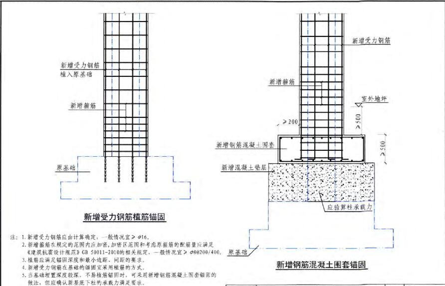 5. 當基礎埋置深度較深,不易植筋錨固時,可采用新增鋼筋混凝土圍套錨固的 做法,但應確認新基底下柱的承載力滿足要求 。