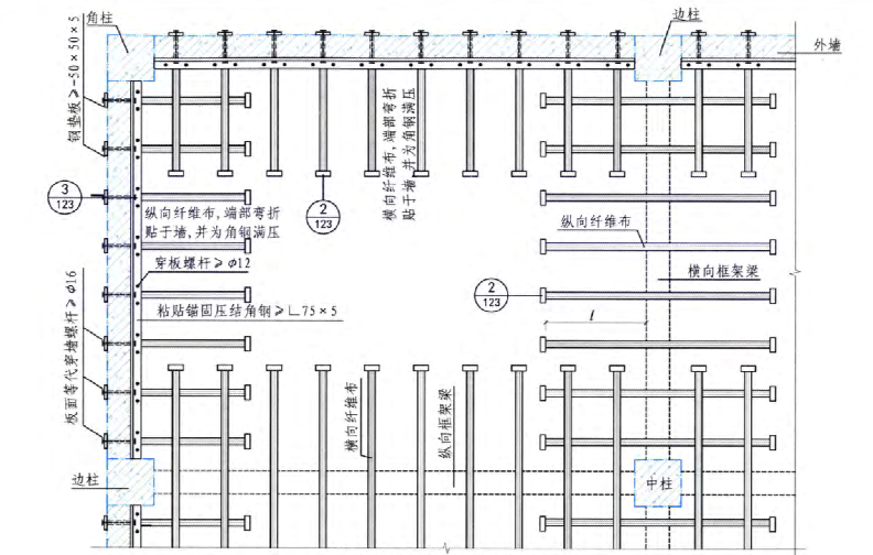 1. 纖維布層數(shù)為 l 層時(shí),文座錨固可采用”錨固角鋼+螺桿”的 方法。