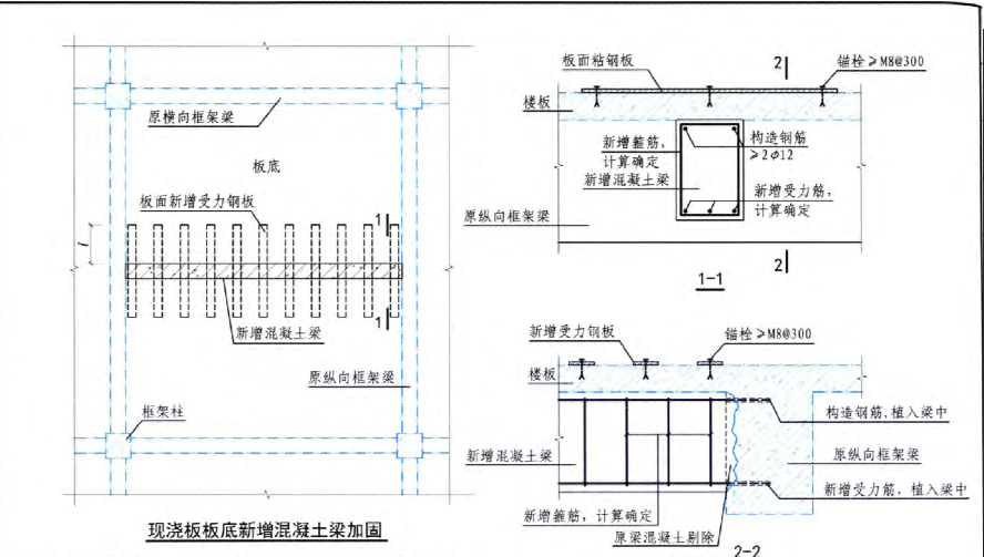 2.l由計算確定,應(yīng)滿足受力及鋼板的錨固長度,且不小于新結(jié)構(gòu) 1 / 4板短邊計算跨度 。