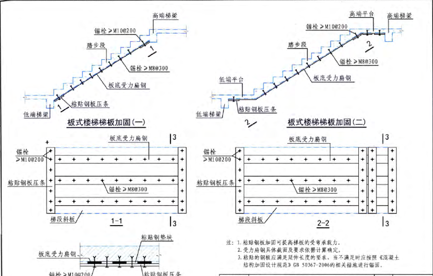 1. 粘貼鋼板加固可提高梯板的受彎承載力 。
