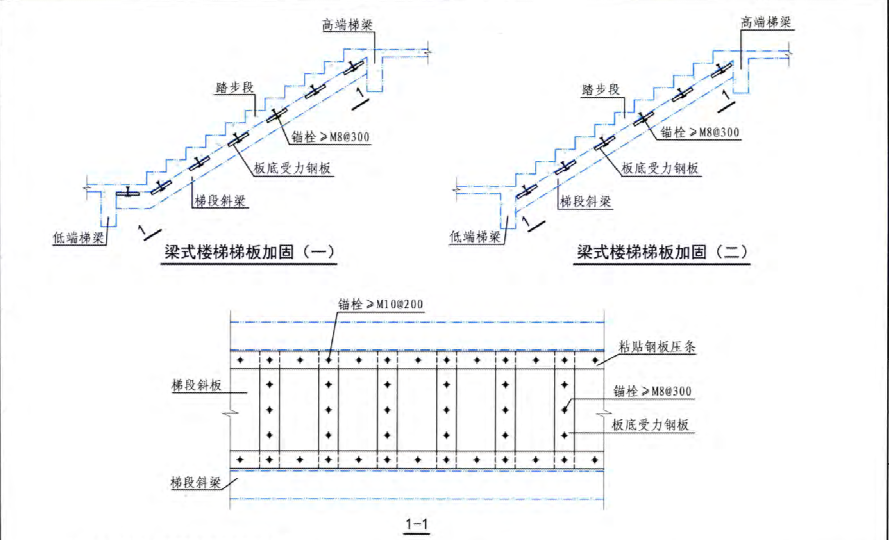 3. 1 梁式樓梯中,梯段板為單向斜板,跨度較小,梯段自重和 活荷載沿短向傳遞至兩側(cè)斜梁,梯段斜梁和斜板的加固原理和 具體方法可采用板式樓梯加固的做法。