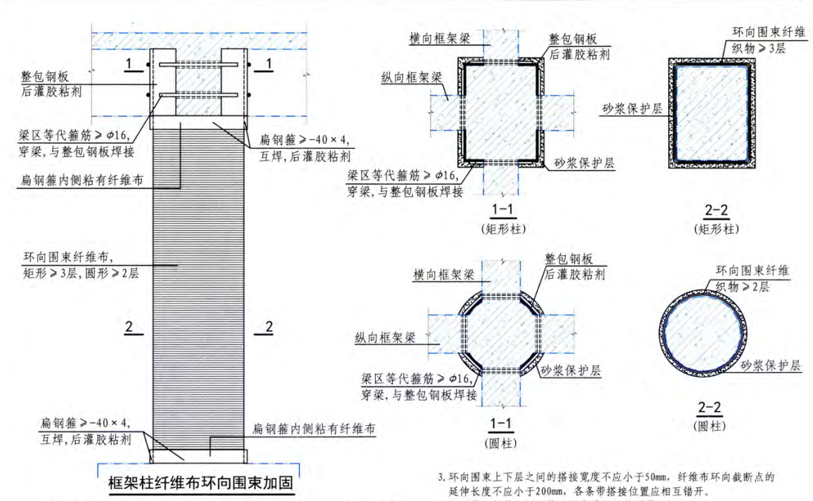 3.環(huán)向圍束上下層之間的搭接寬度不應(yīng)小于 50mm ,纖維布環(huán)向截斷點的延伸長度不應(yīng)小于200mm ,各條帶搭接位置應(yīng)相互錯開