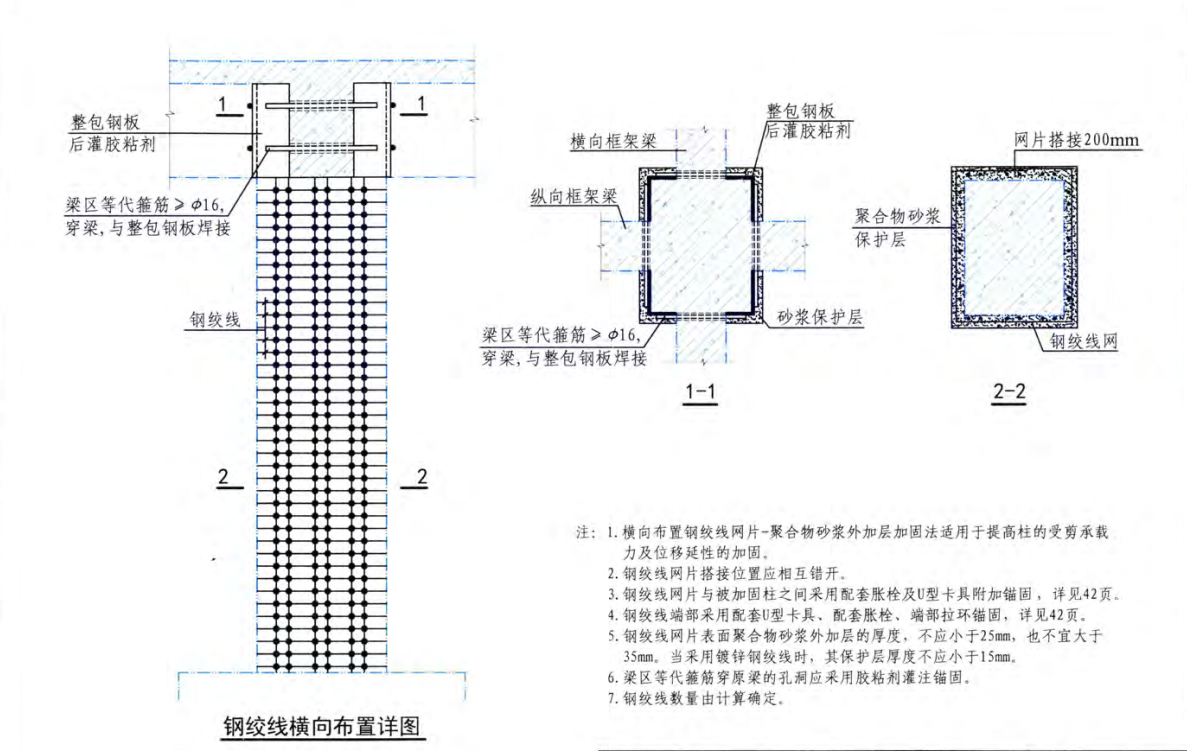 1. 向布置鋼絞線 網(wǎng)片 聚合物砂漿外加層加團(tuán)法適用于提高柱 受剪承載力及位移延性的力口團(tuán)。鋼絞線網(wǎng) 片搭接位置應(yīng)相互錯開。