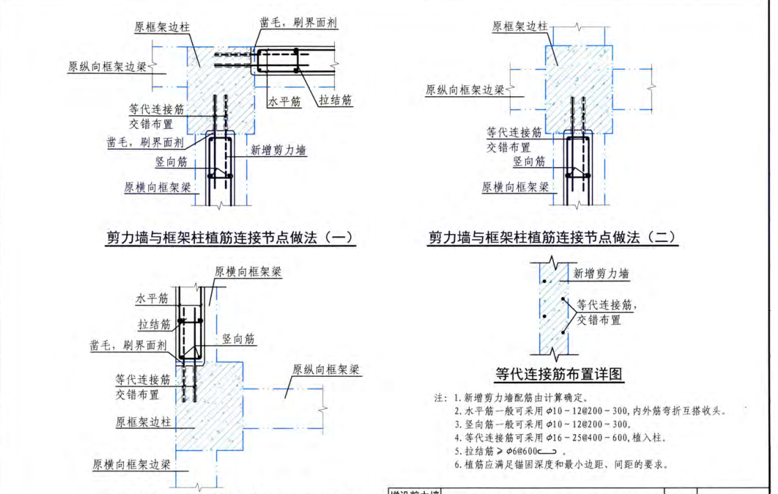 新增剪力墻與原框架柱植筋連接方法如下圖