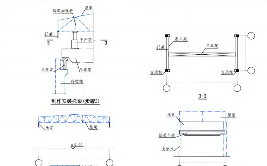 步驟1 驗(yàn)算吊車架 支承柱及基礎(chǔ)等,并加固處理,對(duì)頂升屋架端進(jìn)行局部加強(qiáng) 步驟2 利用吊車架頂升待拔柱上屋架 在零應(yīng)力狀態(tài)下切除待拔上柱