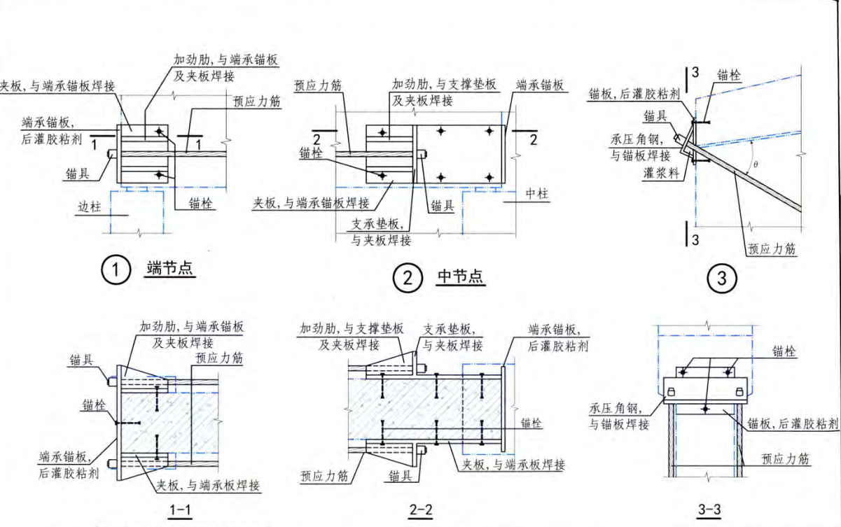 1依據(jù)現(xiàn)場實際情況設置張拉端與錨固端 2端承錨板、支承墊板、夾板、承 角鋼等錨固件應 計算確定 3. 錨具應進行封端保護;預應力筋應進行防火、防腐保護