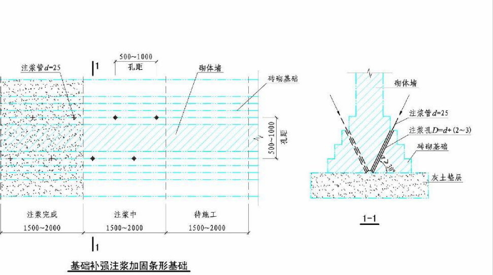 基礎(chǔ)補(bǔ)強(qiáng)注漿加固條形基礎(chǔ)施工做法如下圖