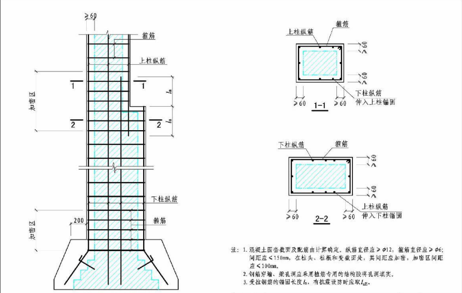 1.混凝土圍套截面及配筋由計(jì)算確定 縱筋直筋應(yīng)12,箍筋直筋應(yīng)6,間距應(yīng)150mm。左柱頭。柱根和變截面處,其間距應(yīng)加密,加密區(qū)間距應(yīng)100mm