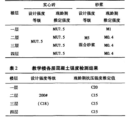 根據(jù)該建筑物的實際使用情況,依據(jù)GB 50023—2009(建筑抗震鑒定標(biāo)準(zhǔn)》第1.0.3—1.0.5條,確定其為A類建筑,即后續(xù)使用年限30年的建筑。經(jīng)現(xiàn)場檢測,該教學(xué)樓各層承重墻體的實心磚和砂漿推定強(qiáng)度見表l,混凝土推定強(qiáng)度見表2。