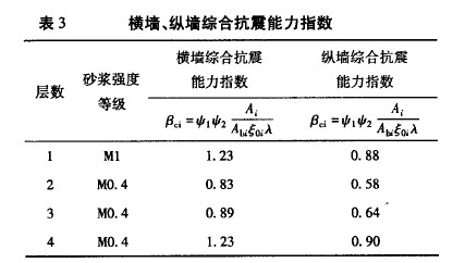 1.4 第二級鑒定對現(xiàn)有結(jié)構(gòu)體系、樓屋蓋整體性連接、圈梁布置和構(gòu)造及易引起局部倒塌的結(jié)構(gòu)構(gòu)件不符合第一級鑒定要求的房屋,根據(jù)抗震鑒定標(biāo)準(zhǔn)第5.2.14條,可采用樓層綜合抗震能力指數(shù)方法進(jìn)行第二級鑒定,同時,樓層綜合抗震能力指數(shù)應(yīng)按房屋的縱橫兩個方向分別計算。根據(jù)GB 50023—2009《建筑抗震鑒定標(biāo)準(zhǔn)》第5.2.14,5.2.15條,教學(xué)樓橫墻、縱墻綜合抗震能力驗算結(jié)果見表3。從表3的計算結(jié)果可以看出,該教學(xué)樓各樓層縱橫墻最弱樓層綜合抗震能力指數(shù) 均小于1.0,其中二層縱墻的綜合抗震能力指數(shù)僅為0.58,遠(yuǎn)小于1.0。因此,應(yīng)對該教學(xué)樓進(jìn)行加固措施,以提高其綜合抗
