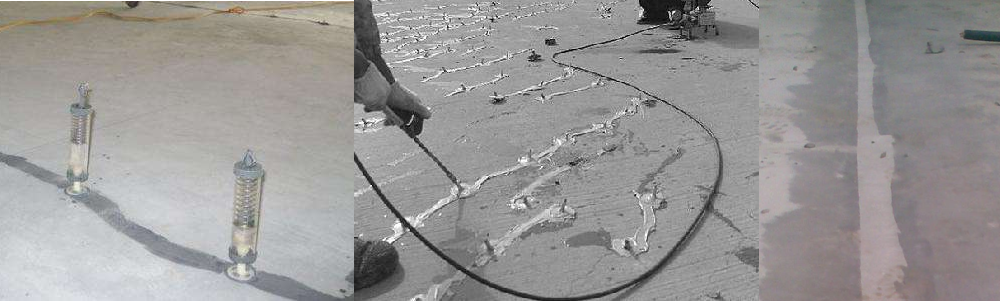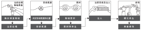 注射法施工工藝流程:裂縫處理(清理) → 粘貼注膠底座→ 封縫→ 配置灌注膠 → 注射裂縫修補(bǔ)膠。
