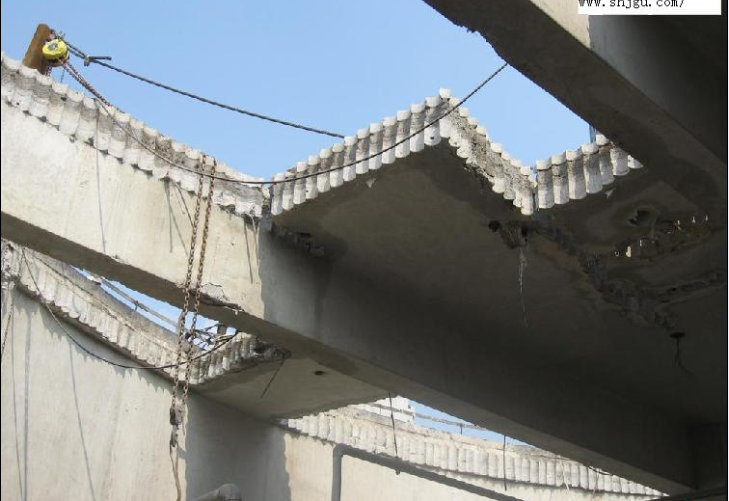 I、切割完后采用2個(gè)手拉葫蘆將切割好的樓板吊裝輕放至下層樓面或地面。