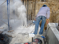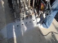 用沖擊鉆鉆孔,鉆頭直徑應(yīng)比鋼筋直徑大5mm左右,鋼筋選用首鋼生產(chǎn)的φ25鋼筋,鉆頭選用φ30的合金鋼鉆頭??咨畲笮?5d(375mm),實(shí)際鉆深400mm.鉆孔時(shí),鉆頭始終與柱面保持垂直。