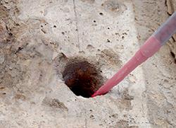 洗孔是植筋中最重要的一個(gè)環(huán)節(jié),因?yàn)榭足@完后內(nèi)部會(huì)有很多灰粉、灰渣,直接影響植筋的質(zhì)量,所以一定要把孔內(nèi)雜物清理干凈。方法是:用喜得利毛刷(這種毛刷不掉毛),套上加長(zhǎng)棒,伸至孔底,來回反復(fù)抽動(dòng),把灰塵、碎渣帶出,再用壓縮空氣,吹出孔內(nèi)浮塵。吹完后再用脫脂棉沾酒精或丙酮擦洗孔內(nèi)壁。但不能用水擦洗,因酒精和丙酮易揮發(fā),水不易揮發(fā)。用水擦洗后孔內(nèi)不會(huì)很快干燥。鉆孔清洗完后要請(qǐng)?jiān)O(shè)計(jì)等有關(guān)單位驗(yàn)收,合格后方可注膠。