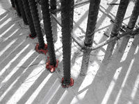 在注膠前梁底模板就已支好,便于植筋后鋼筋定位。植筋前要把鋼筋植入部分用鋼絲刷反復(fù)刷,清除銹污,再用酒精或丙酮清洗。鉆孔內(nèi)注完膠后,把經(jīng)除銹處理過的鋼筋立即放入孔口,然后慢慢單向旋入,不可中途逆向反轉(zhuǎn),直至鋼筋伸入孔底。
