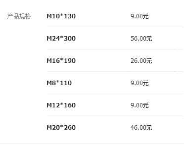 產(chǎn)品規(guī)格 M10*130,M24*300,M16*190,M8*110,M12*160,M20*260